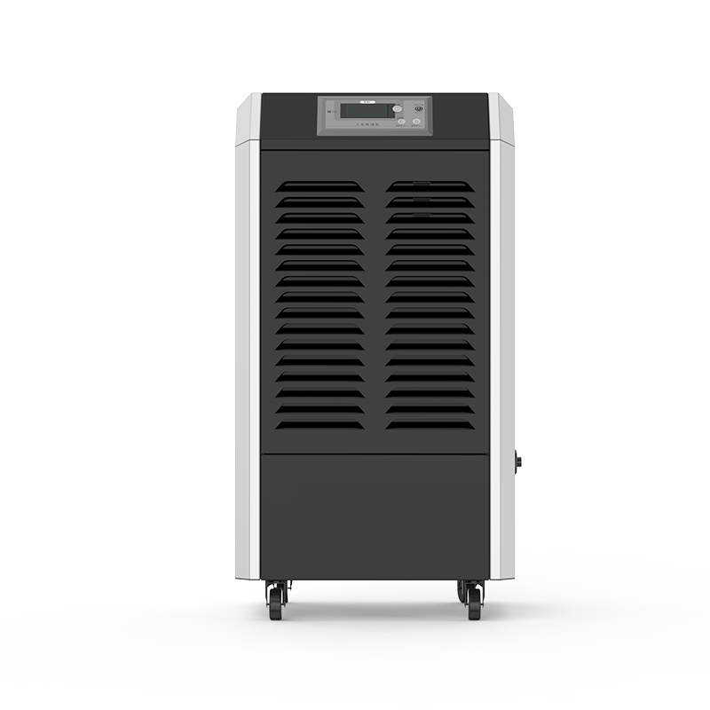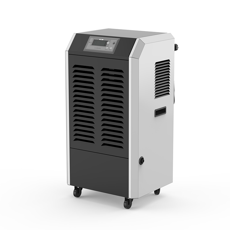 工业用除湿机通过风机将潮湿空气抽入机器内部,通过压缩机制冷将蒸发器降温至露点以下,潮湿空气经过蒸发器在表面凝结成水,汇集至接水盘后,流入水箱中,干爽空气经冷凝器重新加热由出风口排出,这样不断循环将室内湿度降低